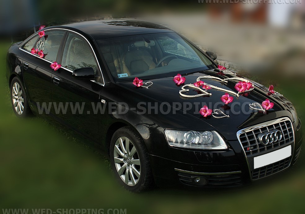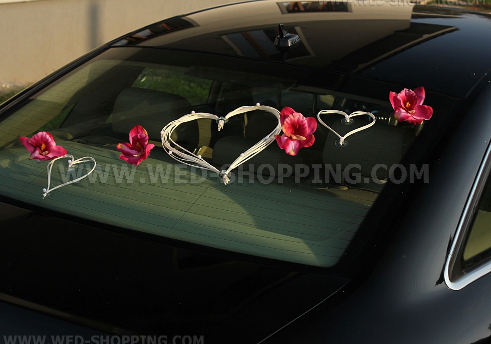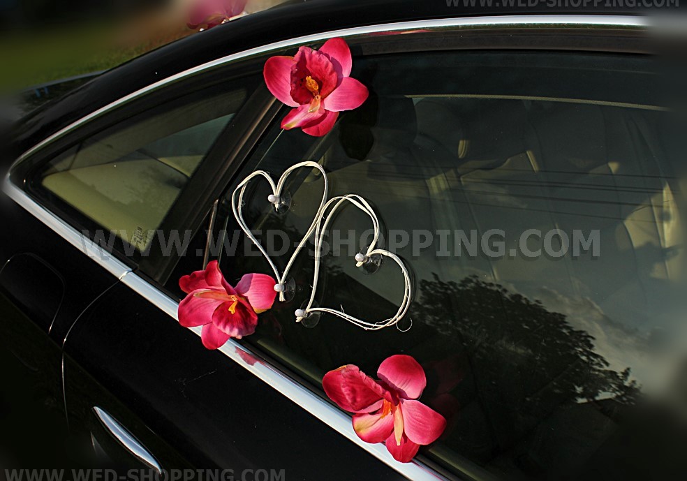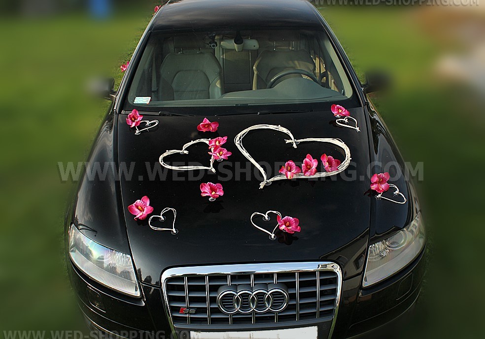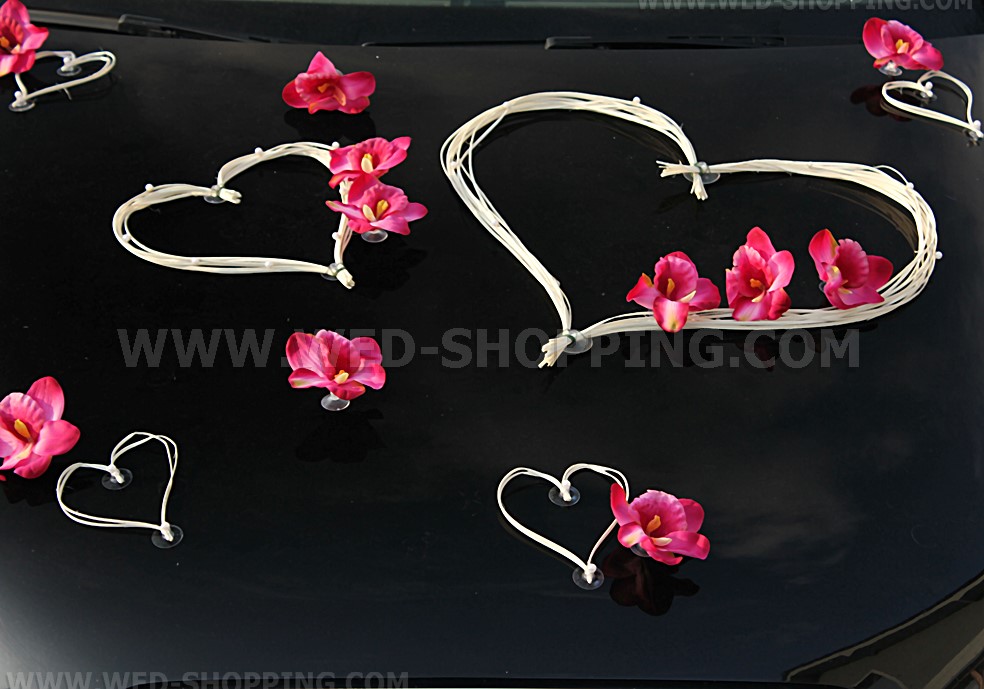 Exclusieve bruiloft decoratie op auto set: 3 grote harten met parels (met zuignappen) 11 kleine harten met de kralen (met zuignappen) 24 bloemen - orchideeën Decoratie veilig voor autolak. Eenvoudig te installeren. Zeer elegante samenstelling. Hoge kwaliteit. Gemaakt in de EU. Levering in circa 10 werkdagen. Vraag om een snellere levering. Bruidsauto donker roze orchideeën en hart