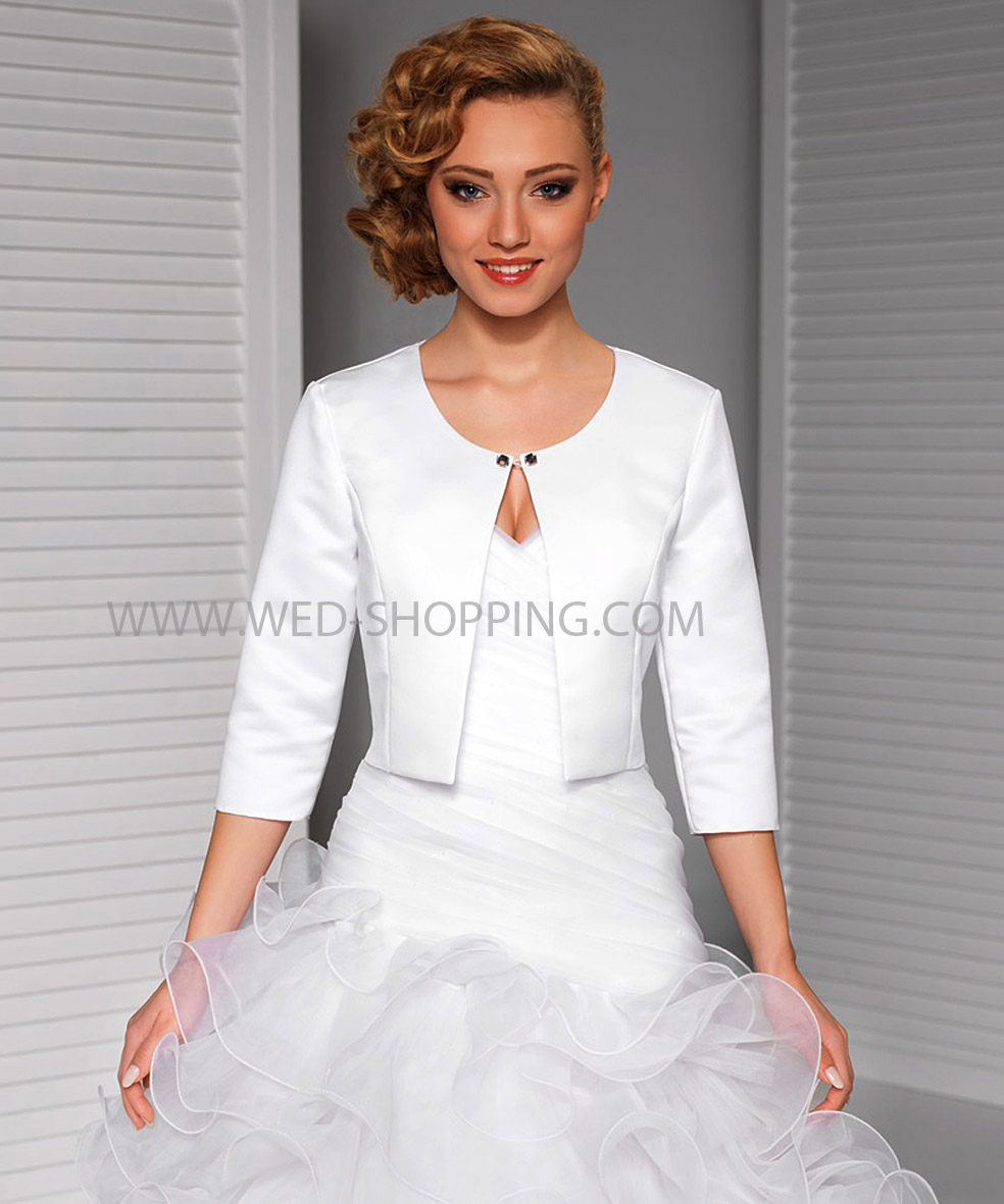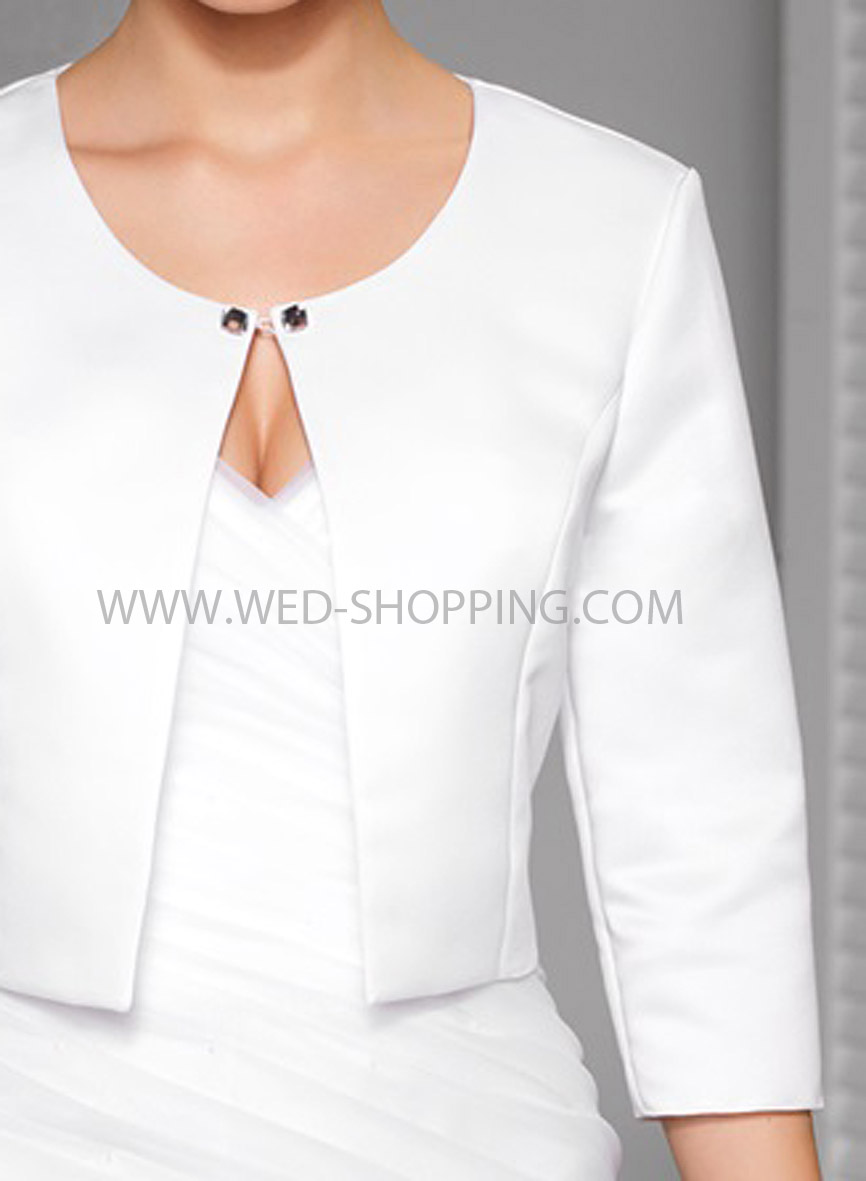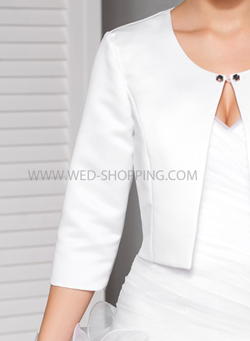 Bolero van satijn 3/4 mouw , kraag (opstaand) Mat: S-7XL (Grote Maat) Leverbaar in wit en ivoor Hoge kwaliteit. Gemaakt in de EU. Leveringstijd is circa 10 werkdagen. Vraag om een snellere levering.