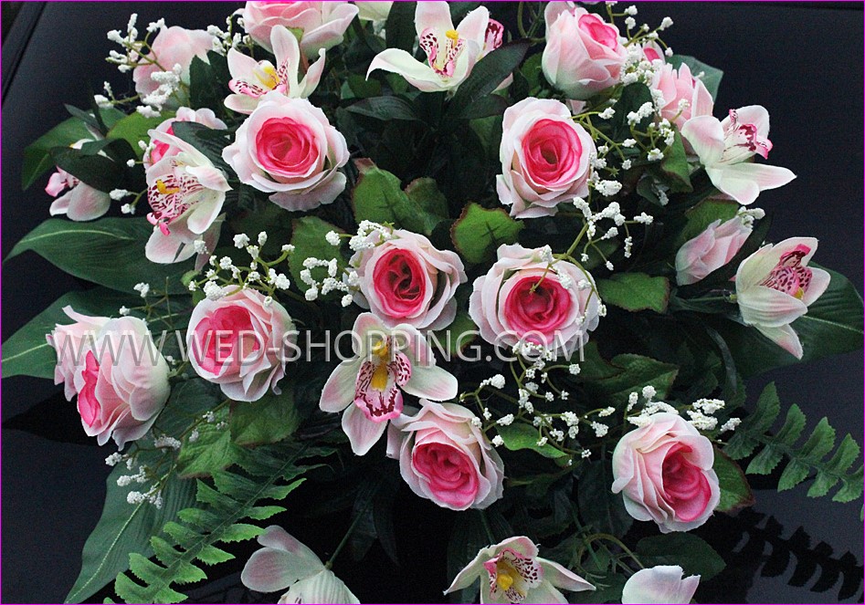 Prachtig auto boeket gemaakt van kunstbloemen. Het bruiloft auto boeket bestaat uit: - roze-room rozen met bladeren - Roze-room-orchideeën met bladeren - kleine witte bloemen om het boeket te voltooien - Extra grote groene bladeren Het boeket heeft 3 zuignapjes (niet zoals de meeste auto bouqets) om het op een auto te repareren. Lengte: 70cm / 28 Breedte: 50cm / 20 Hoogte: ongeveer 25 cm / 9 Hoge kwaliteit. Gemaakt in de EU. Leveringstijd is circa 10 werkdagen. Vraag om een snellere levering.