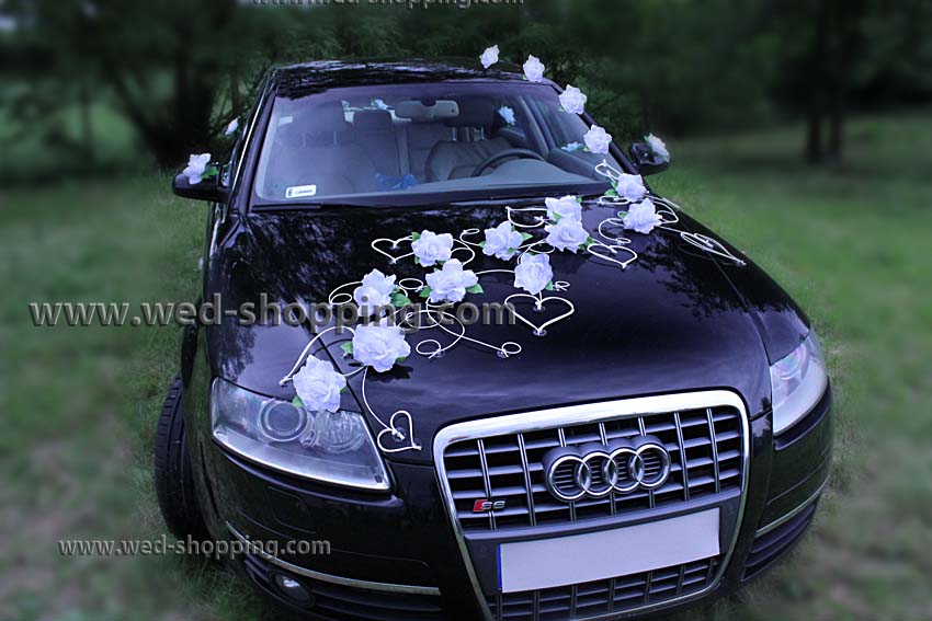 Decoratie bestaat uit: 24 ontwikkelde landen nam knoppen en bladeren in (aan de voorkant, achterkant en zijkanten van de auto) 12 rotan twijgen afgerond harten. Decoratie in de foto is slechts een voorstel en mag vrij worden gelegd. Decoratie wordt op zuignappen die veilig zijn voor de lak zijn gemonteerd. Hoge kwaliteit. Gemaakt in de EU. Levering in circa 10 werkdagen. Vraag om een snellere levering. Decoratie - Bruidsauto versieren ivoor rozen en hart