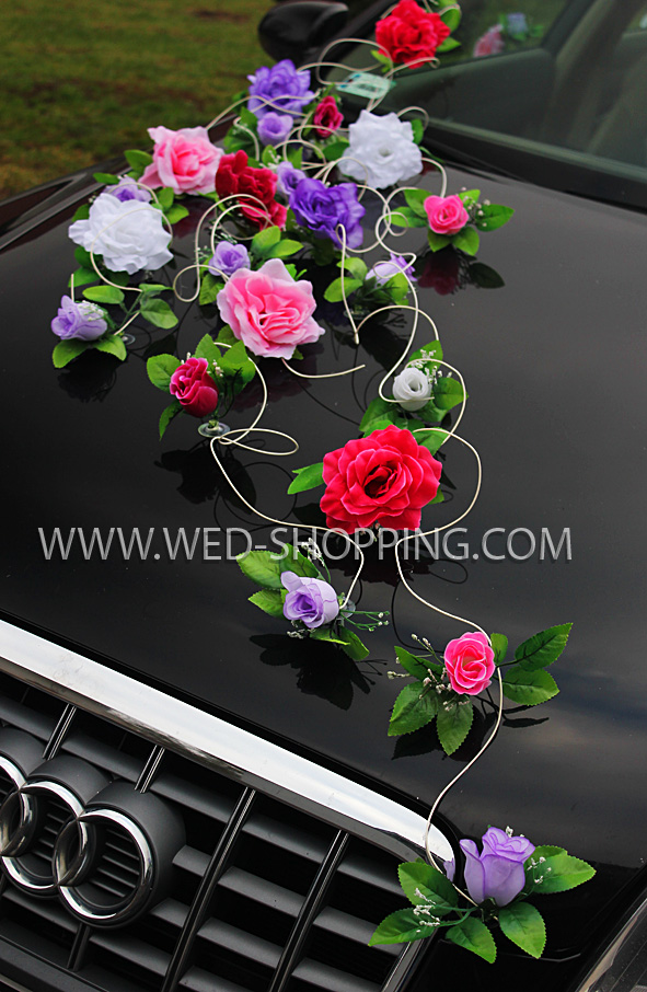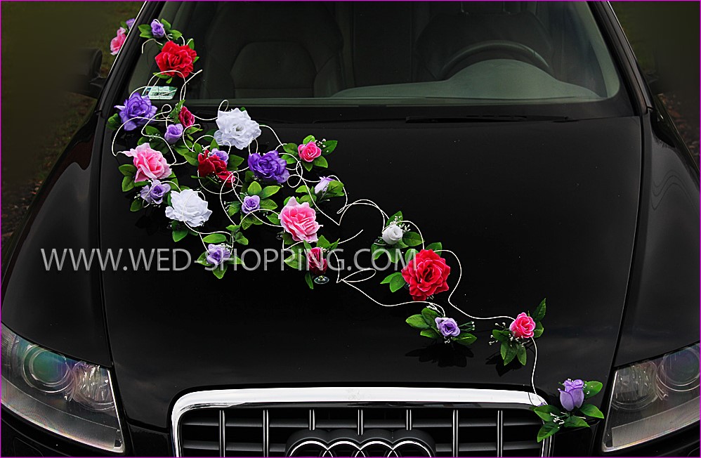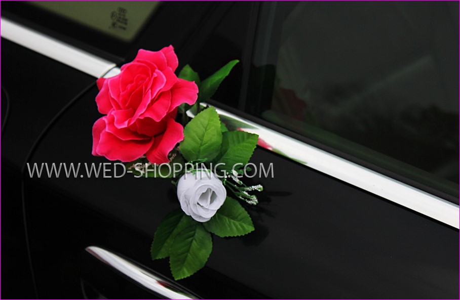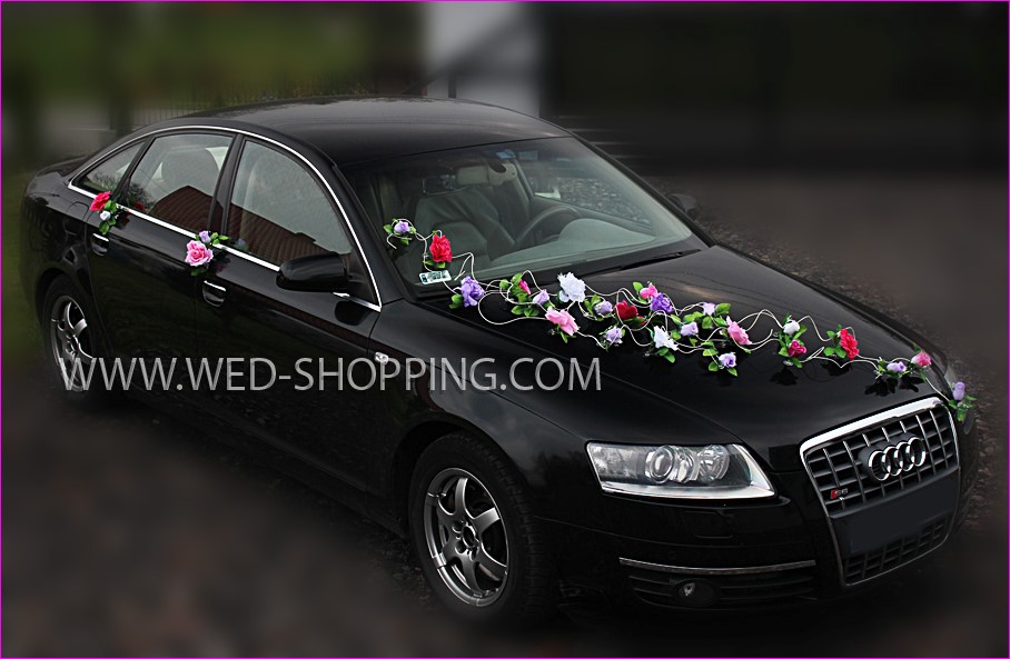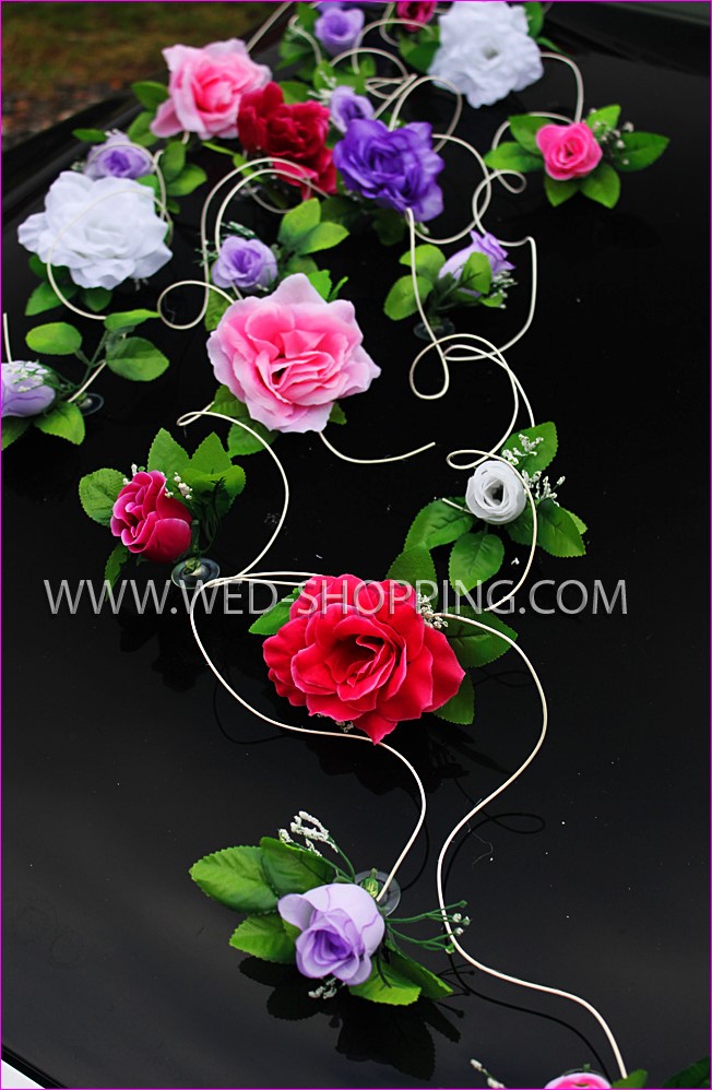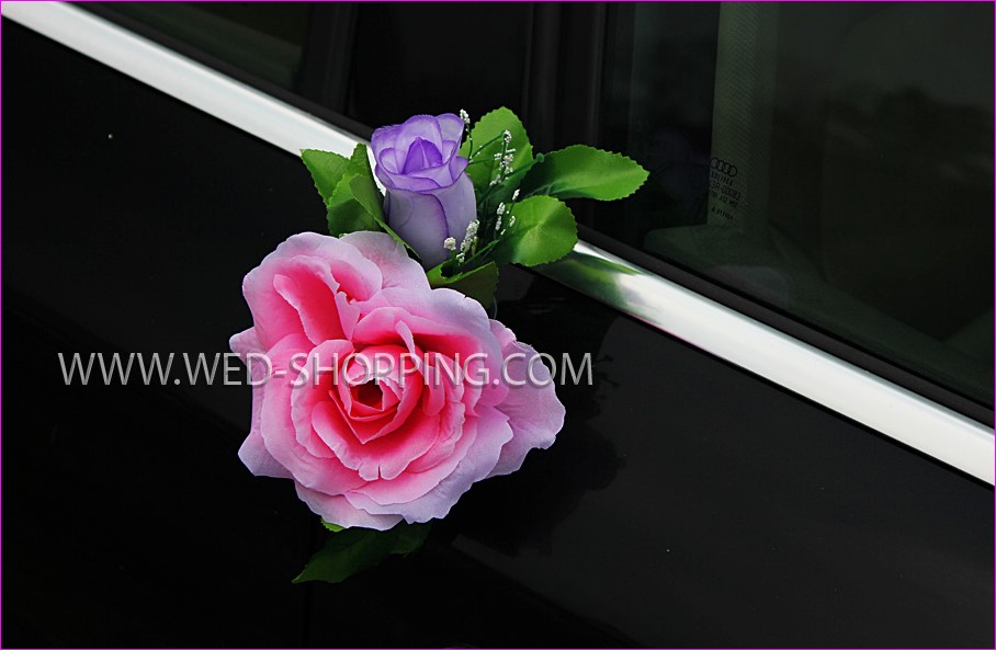Set van kleine boeketten met rozen en bladeren. Rozen in roze, wit, lila en bordeaux. 5 witte rotantakjes Elk element met zuignap voor eenvoudige montage voor soepele oppervlakken van autos. Zuignappen zijn veilig voor autolakken. Hoge kwaliteit. Gemaakt in de EU. Levering in circa 10 werkdagen. Vraag om een snellere levering. decoratie Trouwauto