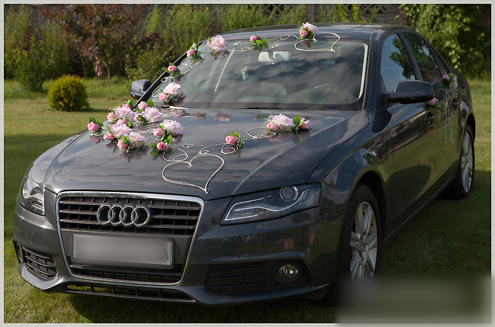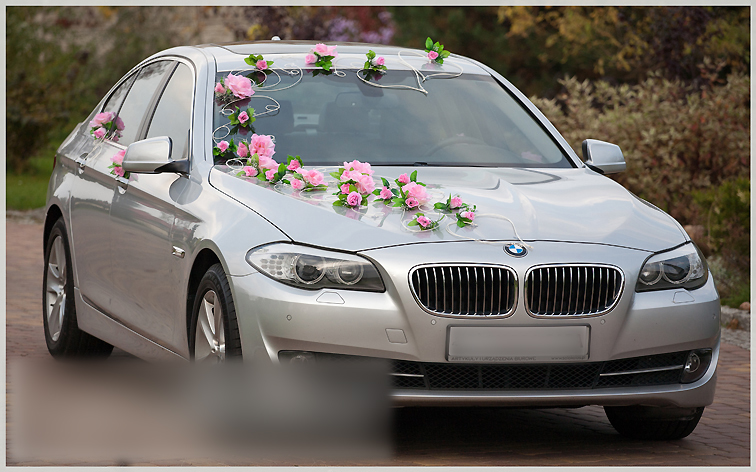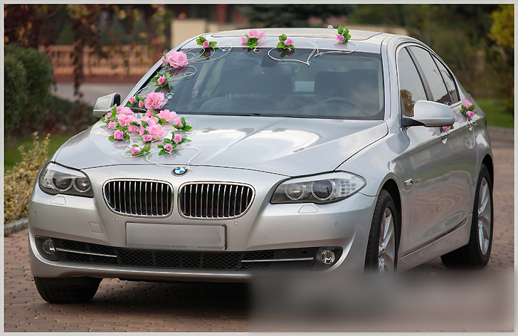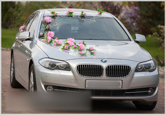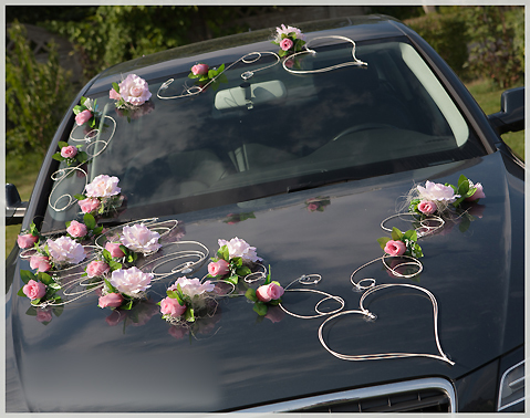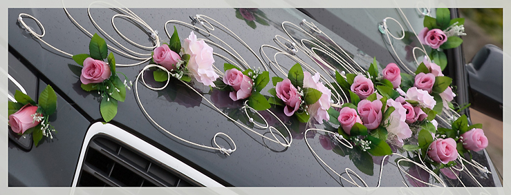 Prachtige bloemendecoratie is gemaakt met roze rozen, rotan en kralen.