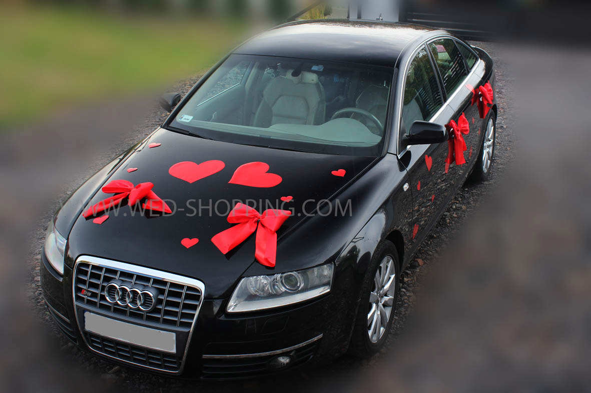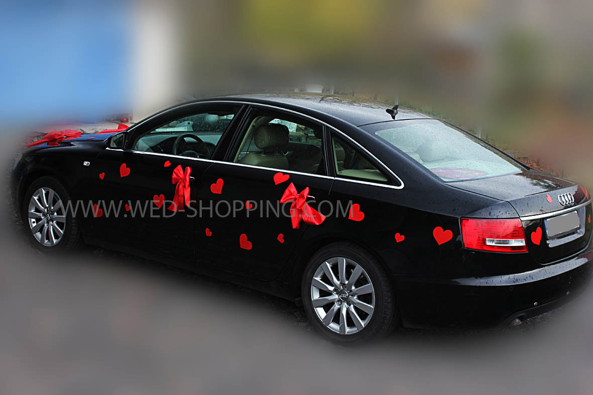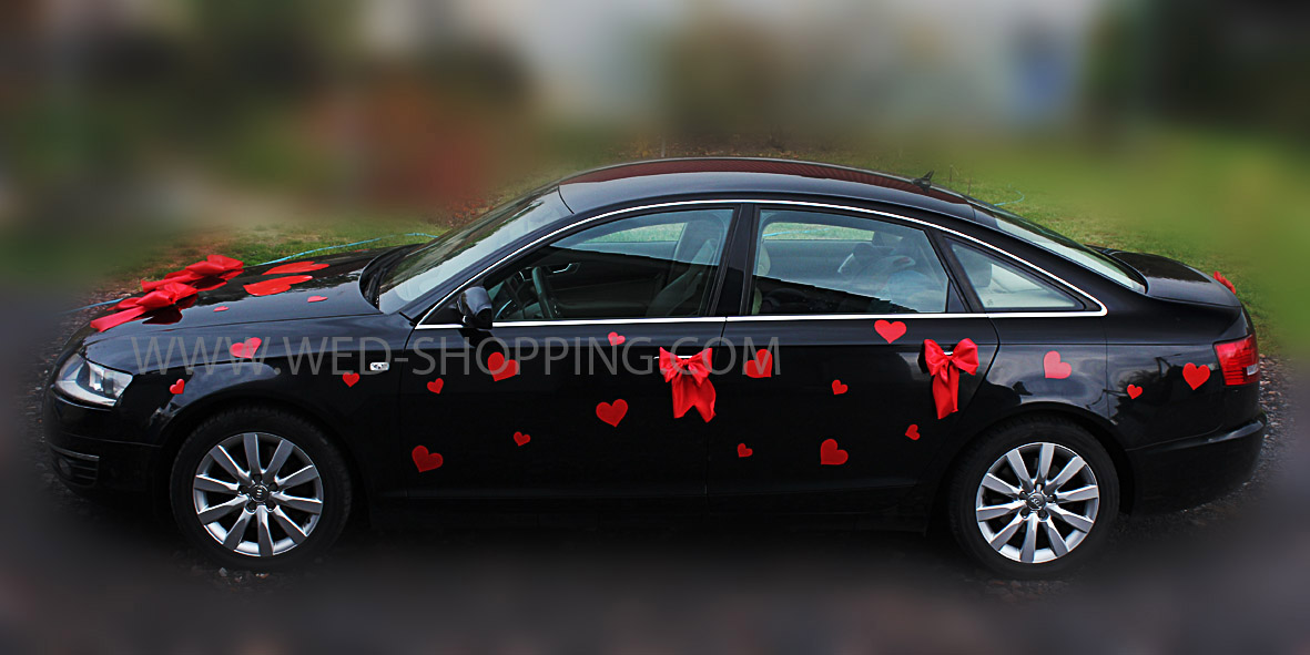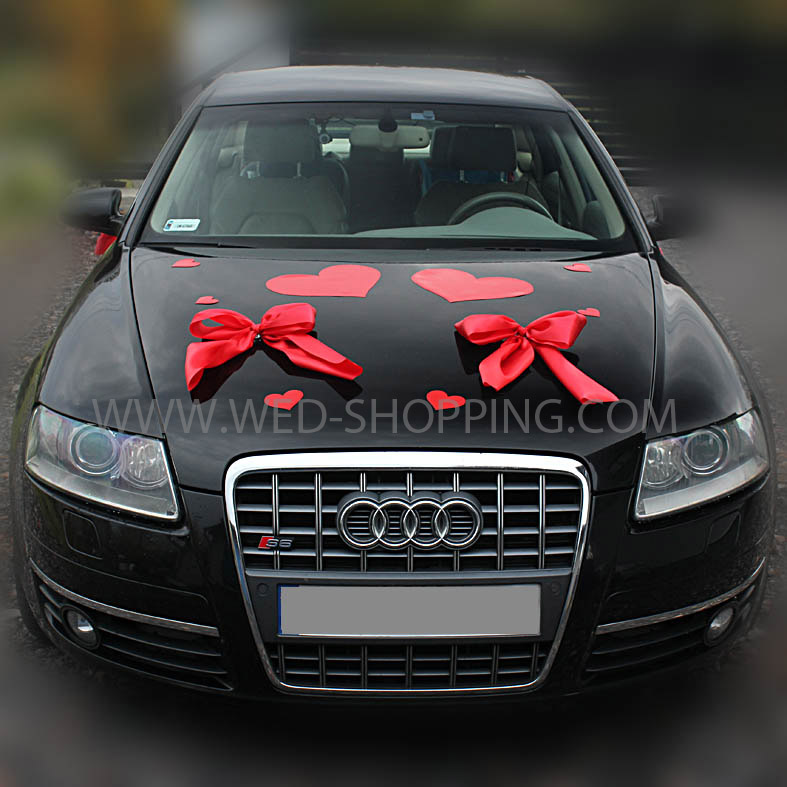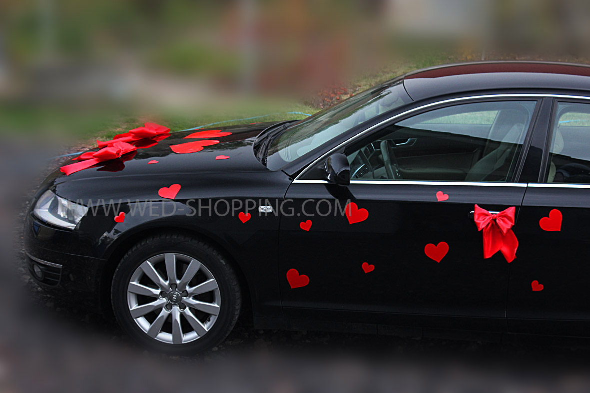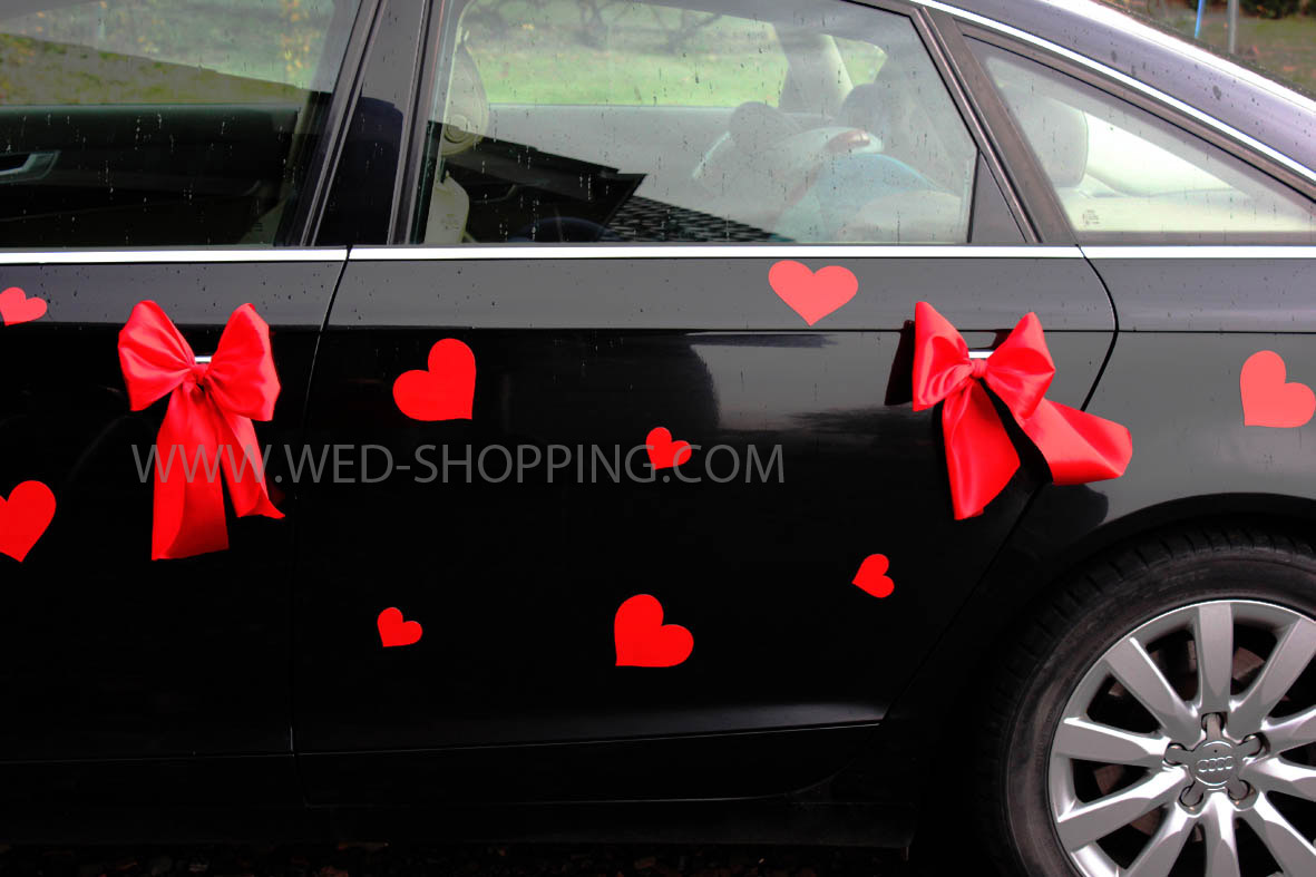 Decoratiepakket zonder bloemen voor trouwauto De kit bevat: - 2 grote harten (30 cm) - 40 kleinere harten (11 en 6 cm) - 4 satijnen strikken voor de deur decoratie en terug - 2 grotere satijnen bogen voor motorkap ongeacht het weerbericht herbruikbare residu-vrije verwijdering Decoratie is veilig voor het oppervlak van de auto Kleur rood Hoge kwaliteit. Gemaakt in de EU. Leveringstijd is circa 10 werkdagen. Vraag om een snellere levering.