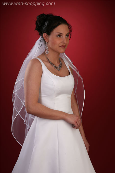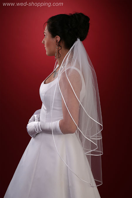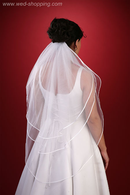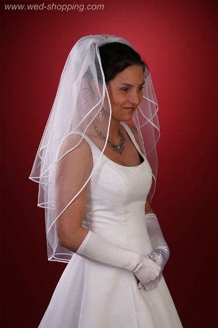 Sluier drielaags - 90 cm Afgewerkt met een satijnen band Laags: 90/60/50 cm lang 140 cm breed disponibel in wit en ivoor Hoge kwaliteit. Gemaakt in de EU. Levering in circa 10 werkdagen. Vraag om een snellere levering.