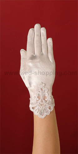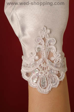 Handschoenen met en kant, met vingers Gemaakt van glanzend elastisch satijn Kleur: wit en ivoor Hoge kwaliteit. Gemaakt in de EU. Leveringstijd is circa 10 werkdagen. Vraag om een snellere levering.