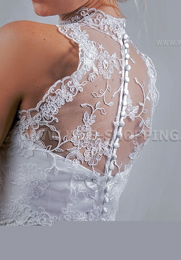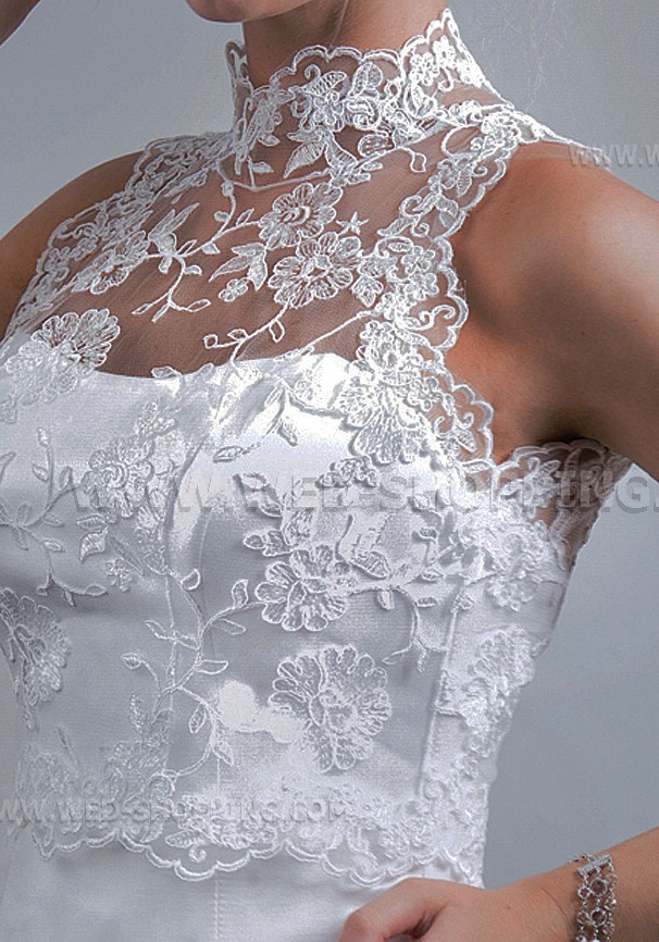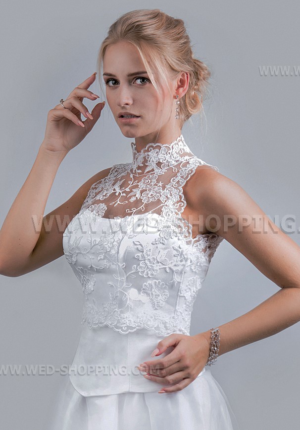 Mouwloze bruids kant bolero jasje gemaakt van geborduurde kant. Hoge kraag Sluiting op de rug - knoppen