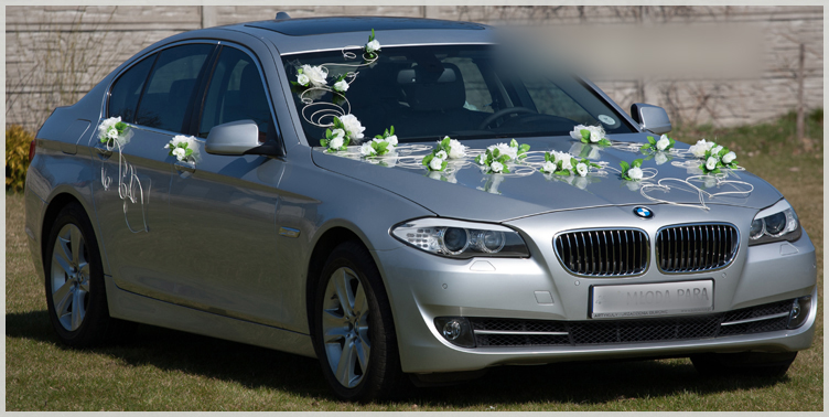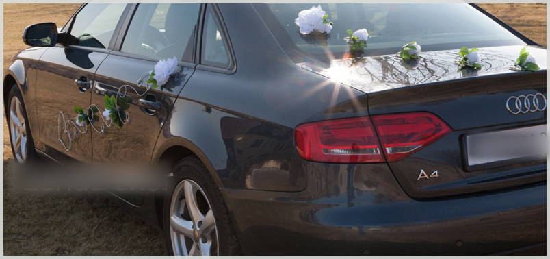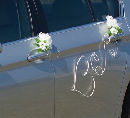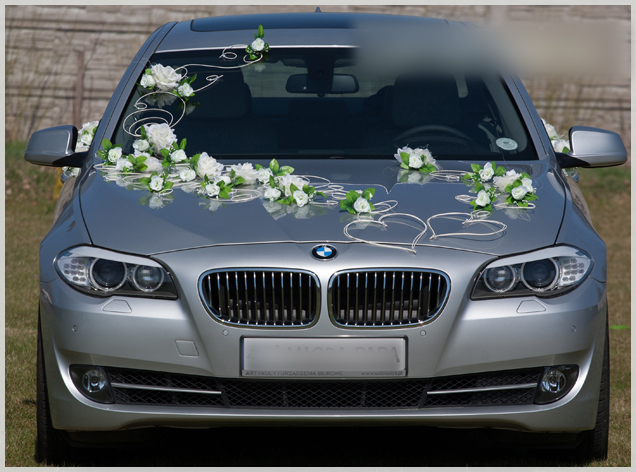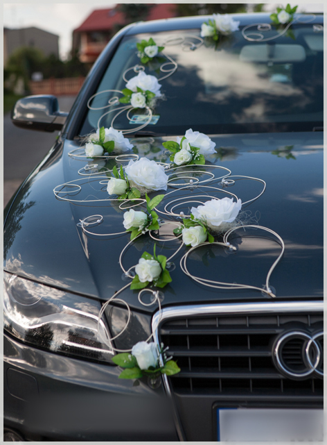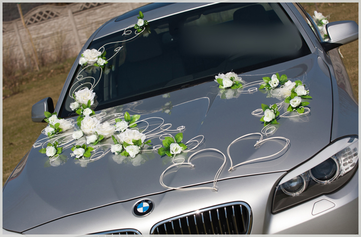 De decoratie van de trouwauto is gemaakt van unieke en exclusieve kunstbloemen