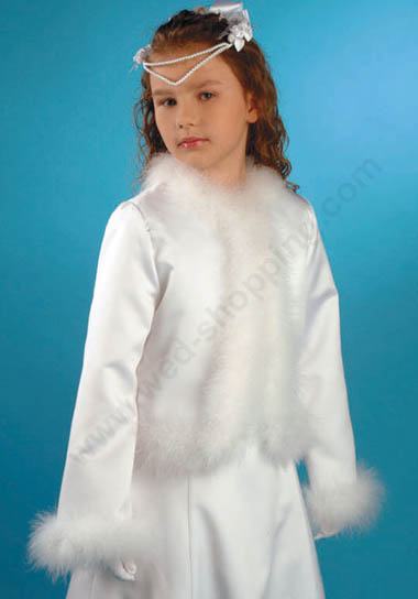 Jasje van gevoerd satijn met marabou (voor Communie of bruiloft) Lange mouwen Marabou veren Leverbaar in wit Maten: S,L (8-11 jaar) Hoge kwaliteit. Gemaakt in de EU. Leveringstijd is circa 10 werkdagen. Vraag om een snellere levering.