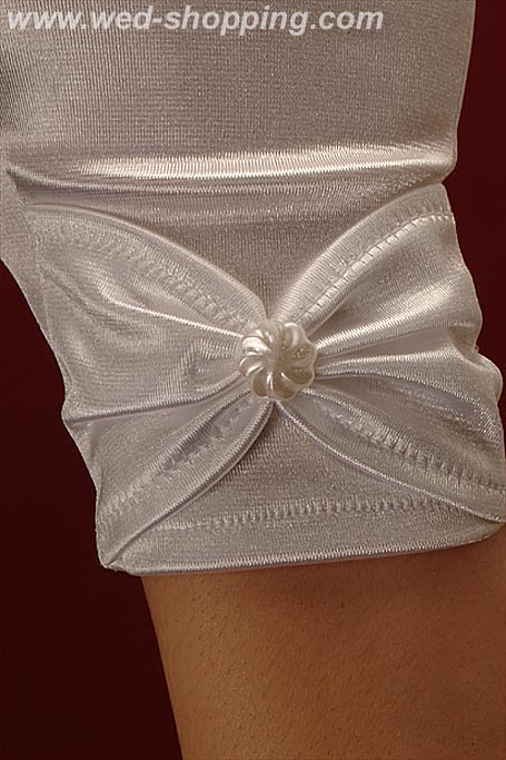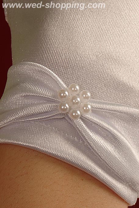 Korte bruidshandschoenen met vingers en manchet manchet met parel knop Gemaakt van glanzend elastisch satijn leverbaar in wit en ivoor Hoge kwaliteit. Gemaakt in de EU. Leveringstijd is circa 10 werkdagen. Vraag om een snellere levering.