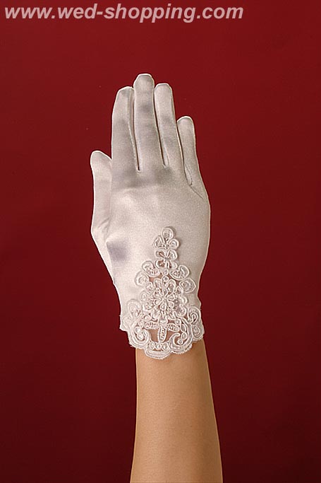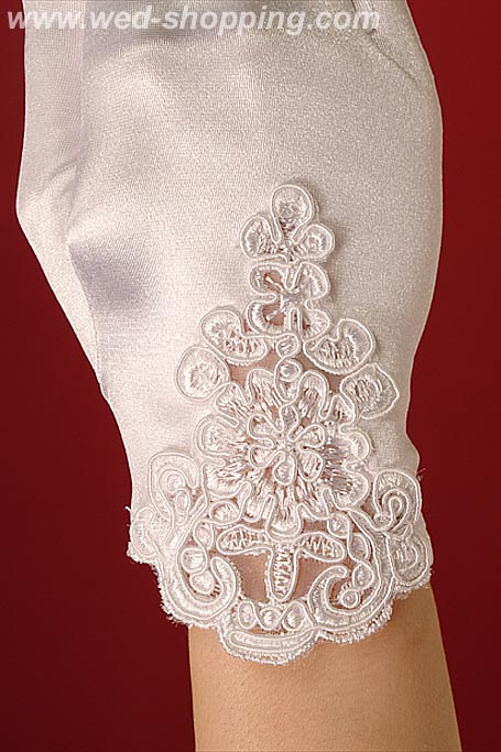Satijnen handschoenen met Kant en Parels Gemaakt van glanzend elastisch satijn Kleur: wit en ivoor (ecru, ivory, avorio) Hoge kwaliteit. Gemaakt in de EU. Levering in circa 10 werkdagen. Vraag om een snellere levering.