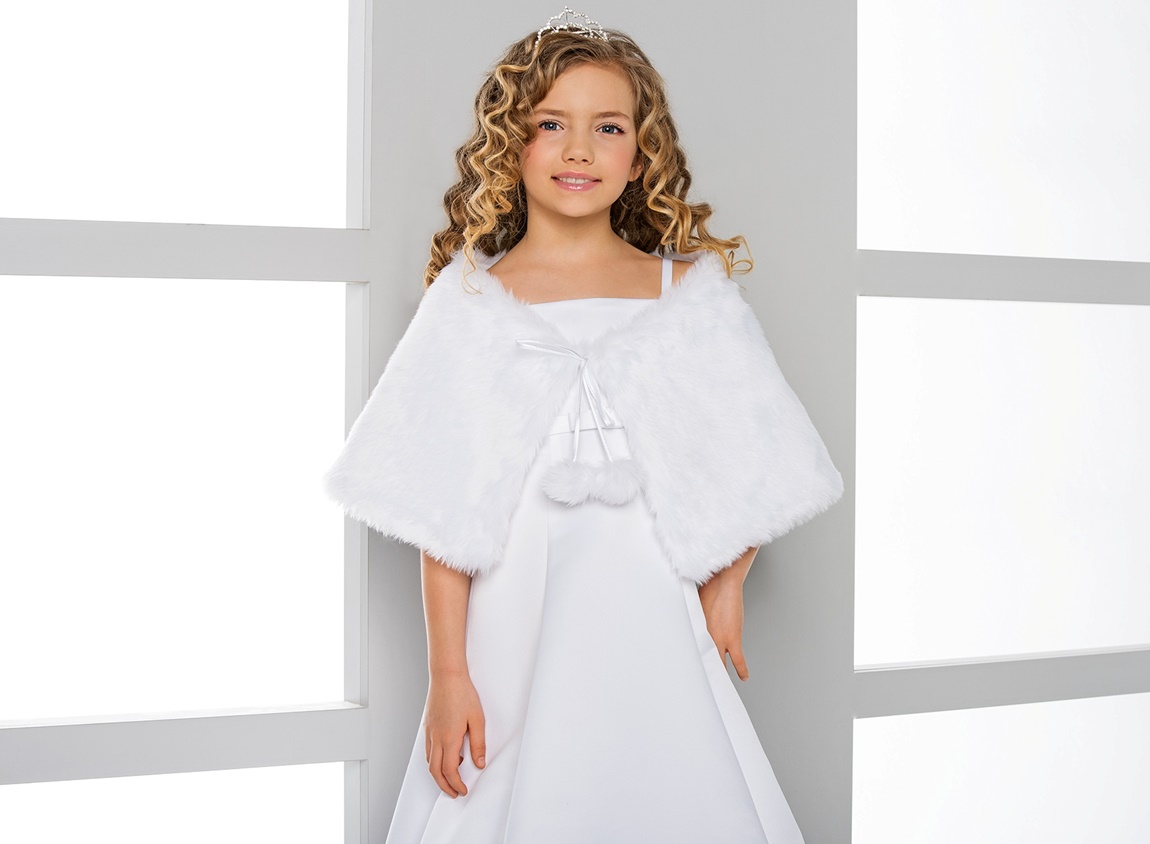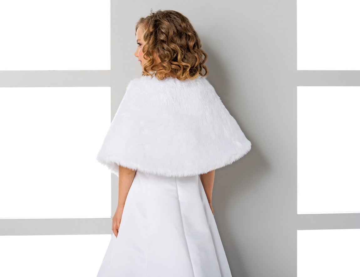 De cape sluit met een satijnen lint met twee pompoenen in dezelfde kleur bont.