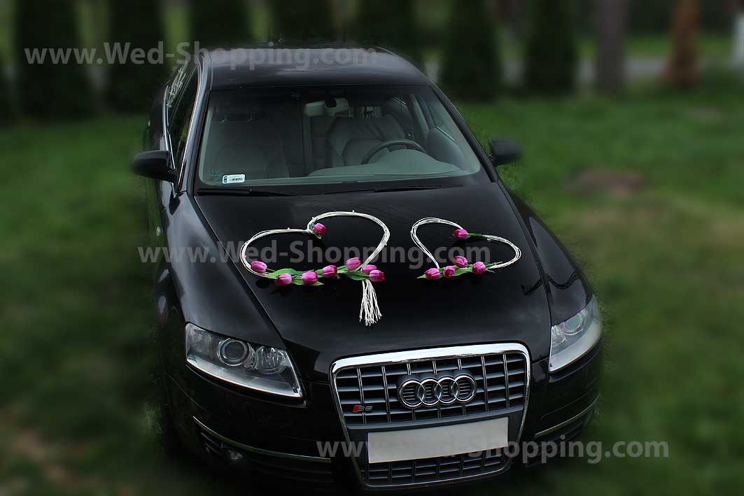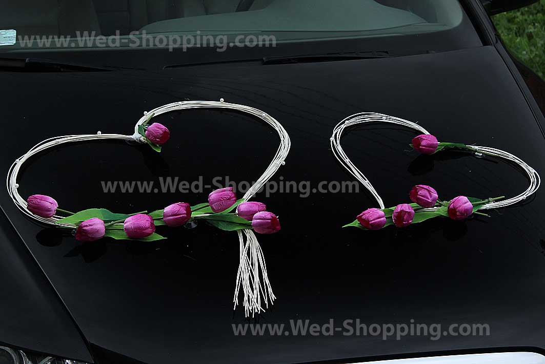 Een unieke decoratie gemaakt van rotan en plastic bloemen. De kit bestaat uit: - Twee grote harten met een breedte van ongeveer 60 tot 45 cm op de motorkap - Twee middelgrote harten met een breedte van ongeveer 29 cm aan de achterruit of de achterklep - Vier harten (breedte: 19cm) op de zijruiten. - Een set van mooie kunstmatige tulpen. Alle elementen zijn voorzien van zuignappen die stevig de versieringen op de auto. Grote en middelgrote harten zijn versierd met kunstmatige parels. Elke bloem heeft zijn eigen zuignap. Zuigkracht is de veiligste methode van bevestiging aan de Hoge kwaliteit. Gemaakt in de EU. Levering in circa 10 werkdagen. Vraag om een snellere levering. Paarse Tulpen Trouwauto Versiering
