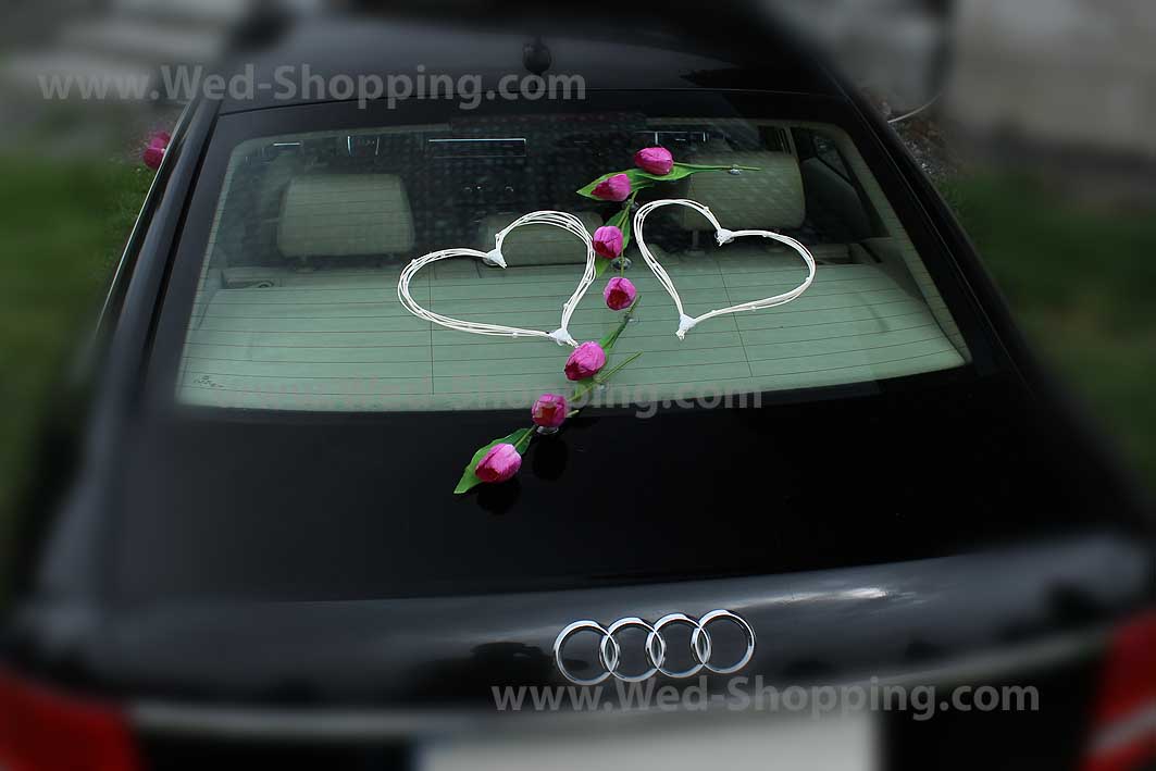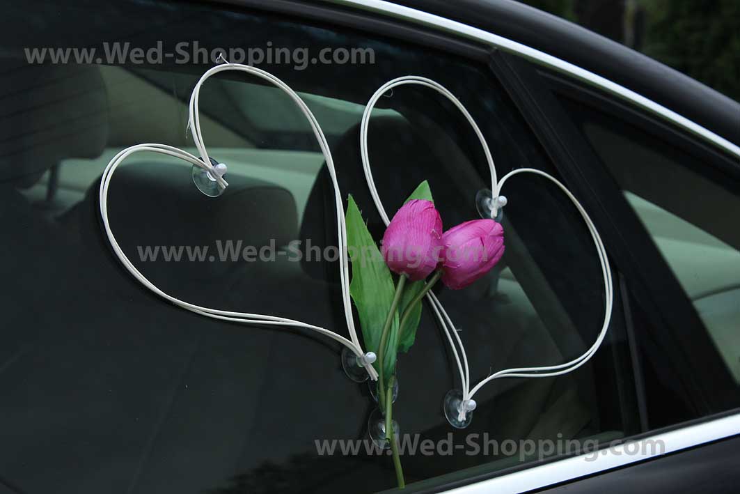 Een unieke decoratie gemaakt van rotan en plastic bloemen. De kit bestaat uit: - Twee grote harten met een breedte van ongeveer 60 tot 45 cm op de motorkap - Twee middelgrote harten met een breedte van ongeveer 29 cm aan de achterruit of de achterklep - Vier harten (breedte: 19cm) op de zijruiten. - Een set van mooie kunstmatige tulpen. Alle elementen zijn voorzien van zuignappen die stevig de versieringen op de auto. Grote en middelgrote harten zijn versierd met kunstmatige parels. Elke bloem heeft zijn eigen zuignap. Zuigkracht is de veiligste methode van bevestiging aan de Hoge kwaliteit. Gemaakt in de EU. Levering in circa 10 werkdagen. Vraag om een snellere levering.