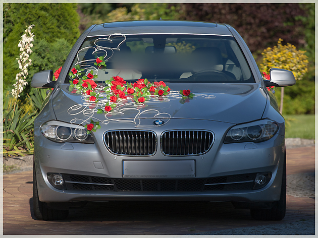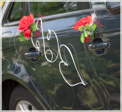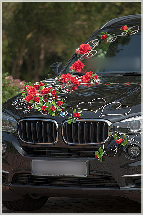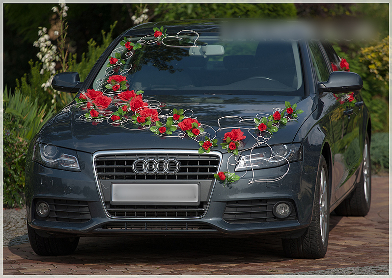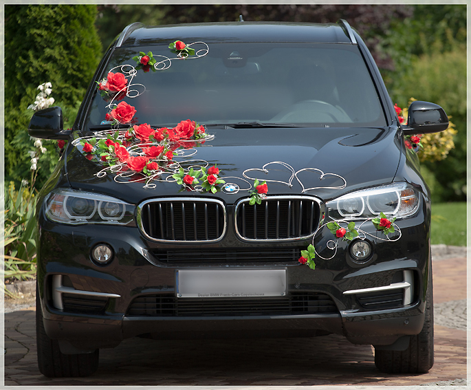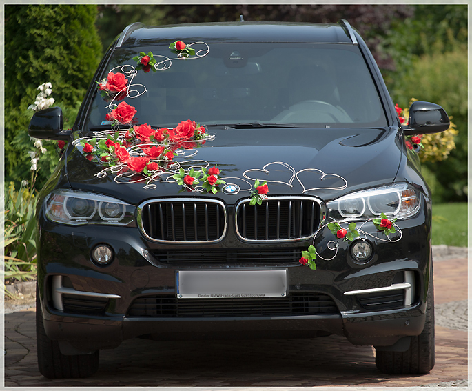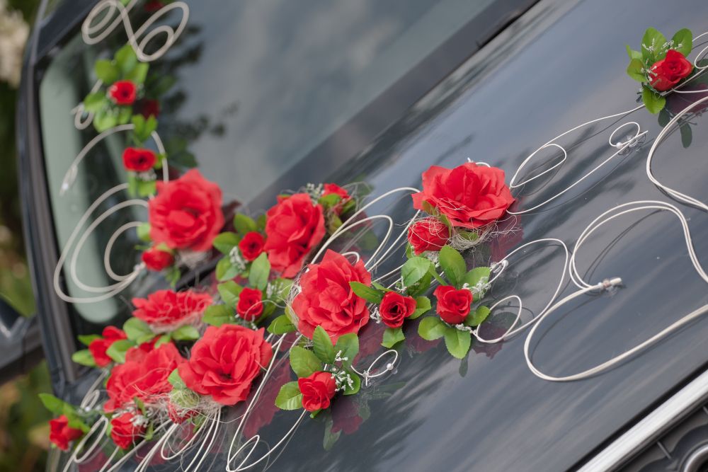 Prachtige bloemendecoratie is gemaakt met rode rozen, rotan en kralen.