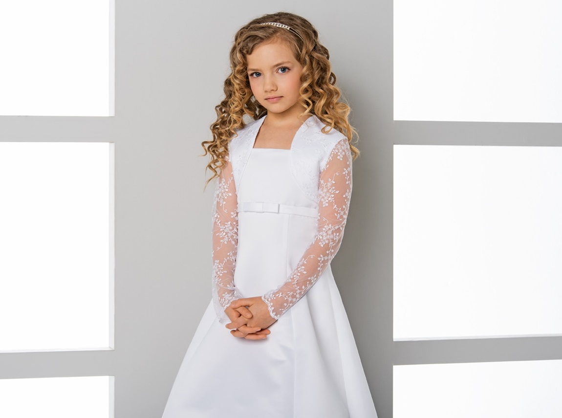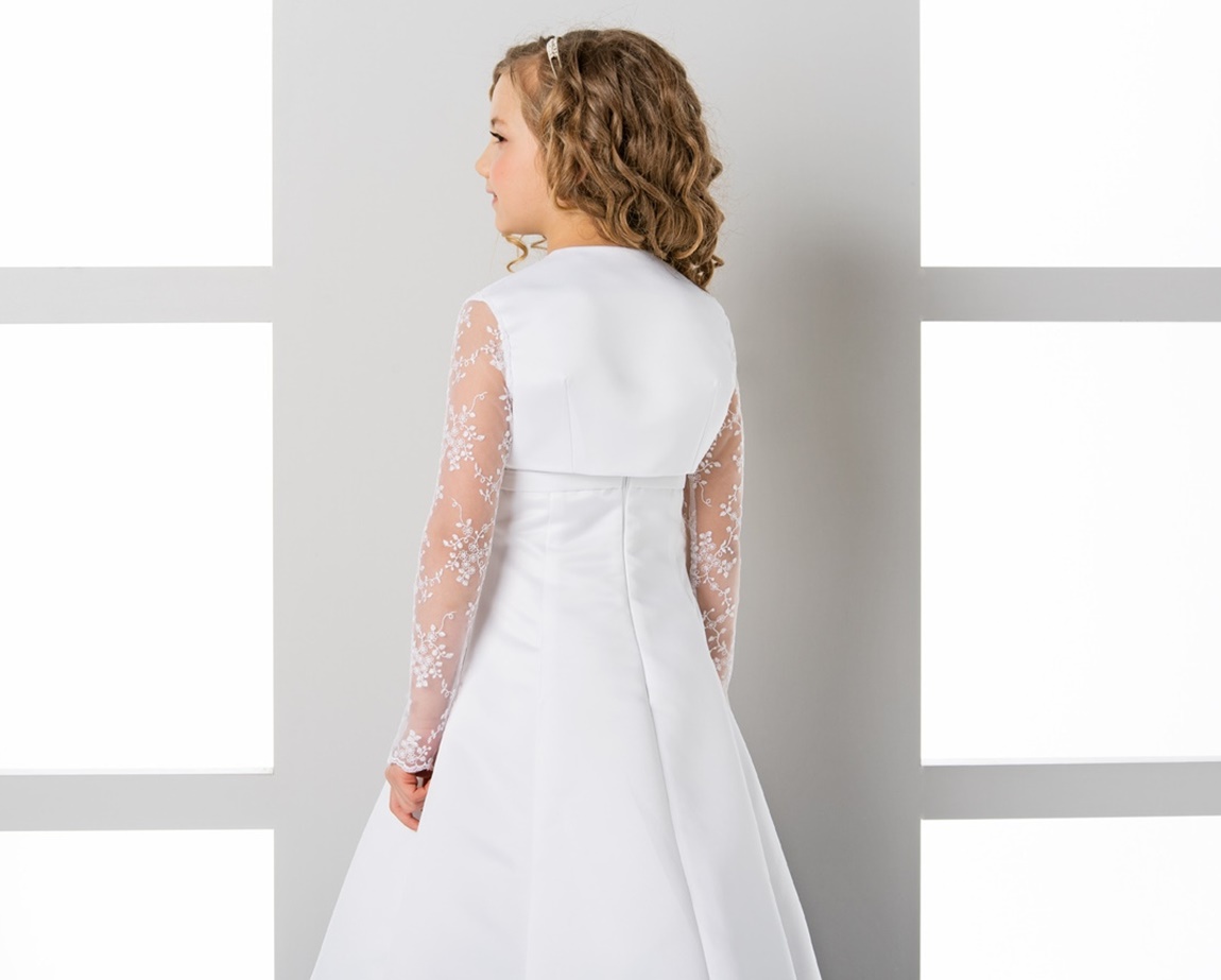 Een prachtig chique satijnen bolero met kanten mouwen voor meisjes voor communie of bruiloft