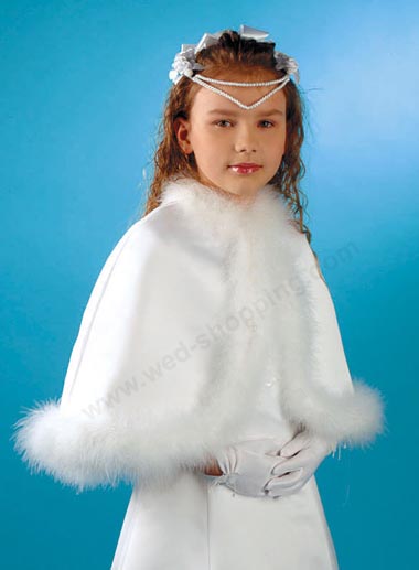 satijnen cape met marabu veren voor communie of bruiloft Een maat: 8-11 jaar Kleur: wit Materiaal : 100% Polyester Hoge kwaliteit. Gemaakt in de EU. Leveringstijd is circa 10 werkdagen. Vraag om een snellere levering.