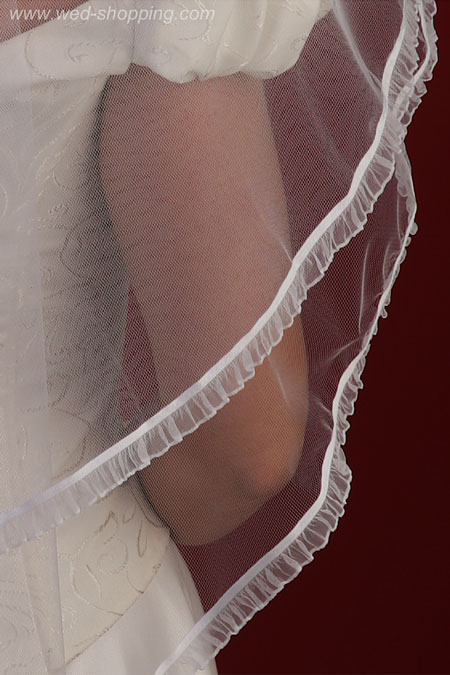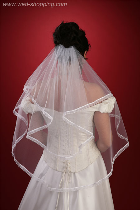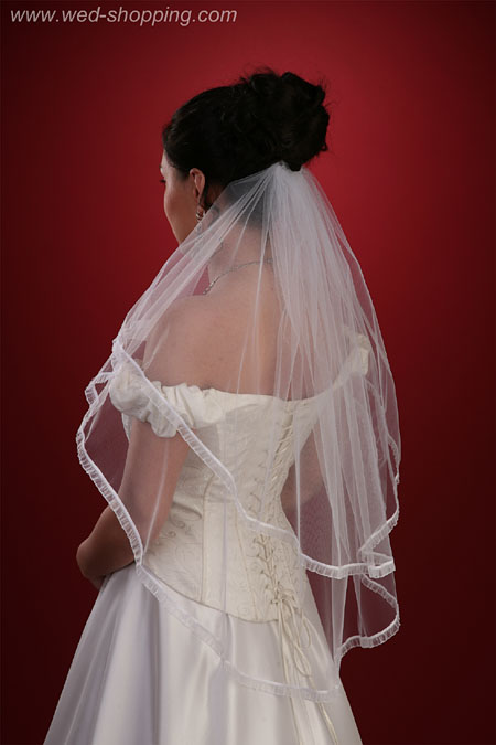 Sluier afgewerkt met chiffon band tweelaags Laags: 80/60 cm lang 140 cm breed disponibel in wit en ivoor Hoge kwaliteit. Gemaakt in de EU. Levering in circa 10 werkdagen. Vraag om een snellere levering.