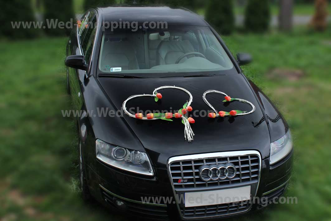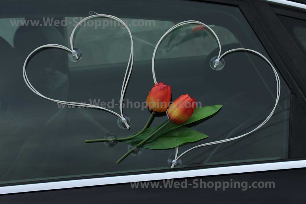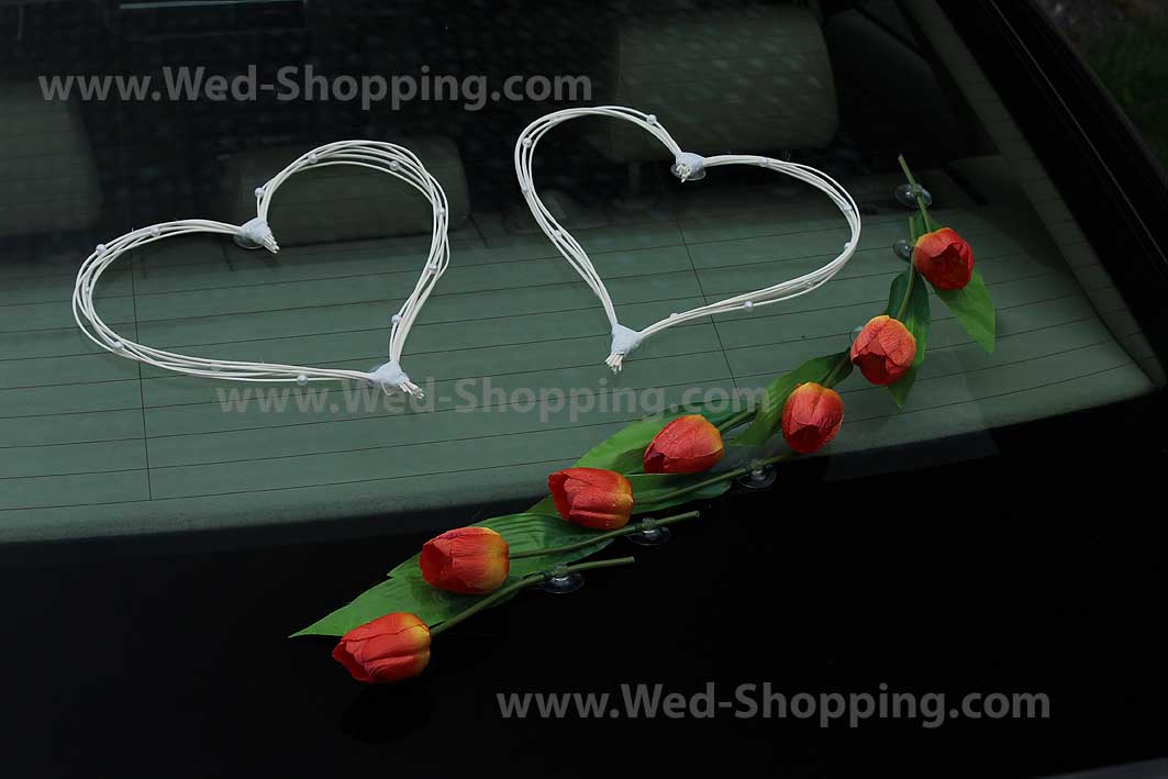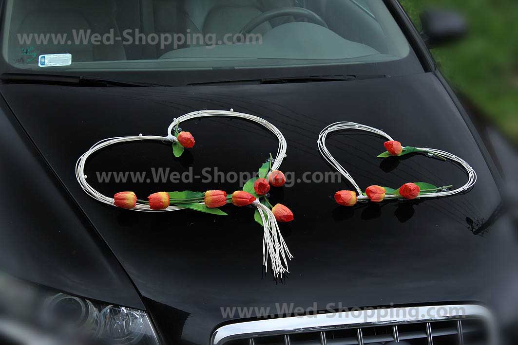 Een unieke decoratie voor uw auto. 2 grote harten versierd met parels (gemonteerd op een zuignap) 2 harten op de achterkant glas - kralen (met zuignappen) 4 harten op de zijkant van de auto (met zuignappen) Set van tulpen met zuignappen. Alle decoratie wordt aan de zuignap bevestigd. Zuignappen niet de autolak beschadigen en stevig vast te houden de decoratie. Decoratie is veilig voor autolak. Hoge kwaliteit. Gemaakt in de EU. Levering in circa 10 werkdagen. Vraag om een snellere levering. Trouwauto boeketten versieren Oranje-gele tulpen
