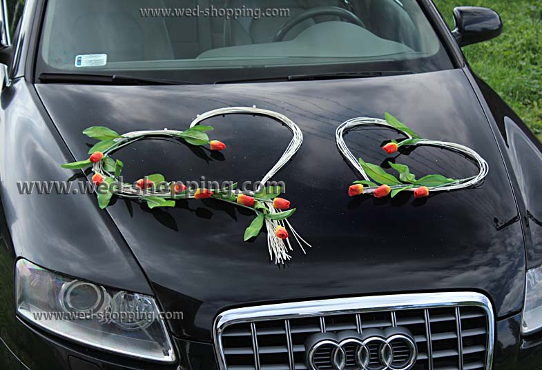 Een unieke decoratie voor uw auto. 2 grote harten versierd met parels (gemonteerd op een zuignap) 2 harten op de achterkant glas - kralen (met zuignappen) 4 harten op de zijkant van de auto (met zuignappen) Set van tulpen met zuignappen. Alle decoratie wordt aan de zuignap bevestigd. Zuignappen niet de autolak beschadigen en stevig vast te houden de decoratie. Decoratie is veilig voor autolak. Hoge kwaliteit. Gemaakt in de EU. Levering in circa 10 werkdagen. Vraag om een snellere levering. Trouwauto boeketten versieren Oranje-gele tulpen