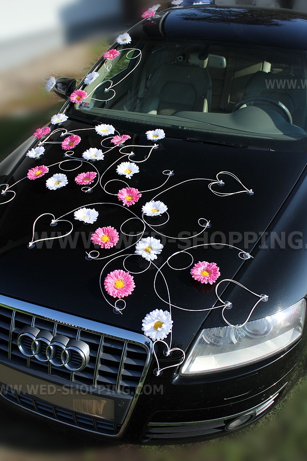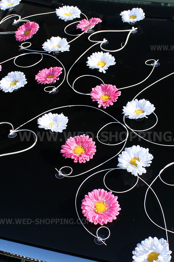 Decoratie bestaat uit: 24 witte gerbera met transparante zuignappen 24 roze gerbera met transparante zuignappen 12 rotan harten met staarten Decoratie veilig voor autolak kunstbloemen Hoge kwaliteit. Gemaakt in de EU. Levering in circa 10 werkdagen. Vraag om een snellere levering.