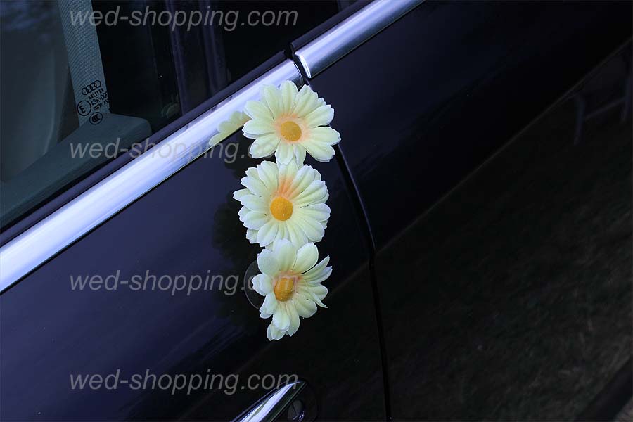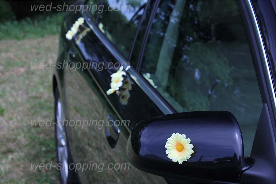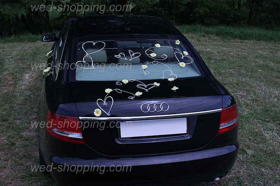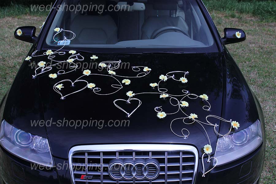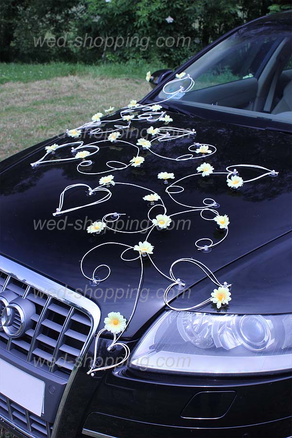 Decoratie bestaat uit: 12 rotan twijgen, samen met de harten van alle soorten en maten - versierd met kralen 28 van madeliefjes op de voorkant van de auto 12 madeliefjes auto zijwaarts (3 op elke deur) 10 van madeliefjes op de achterkant van de auto. De gehele inrichting is op zuignappen die veilig zijn voor de lak zijn gemonteerd. Ook verkrijgbaar met madeliefjes in de kleuren: wit, oranje en crè