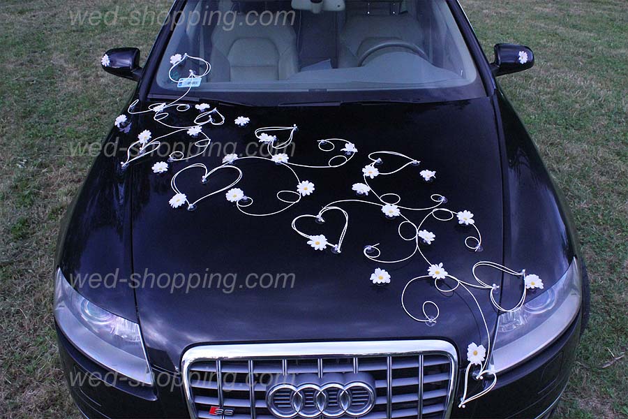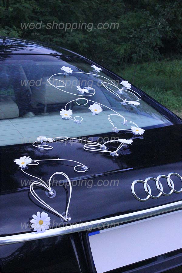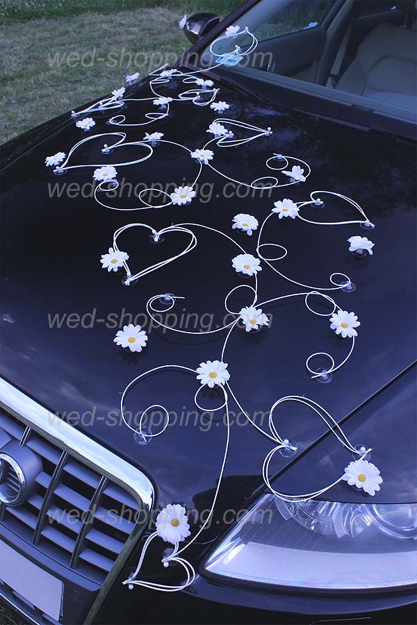 Decoratie bestaat uit: 12 rotan twijgen, samen met de harten van alle soorten en maten - versierd met kralen 28 van madeliefjes op de voorkant van de auto 12 madeliefjes auto zijwaarts (3 op elke deur) 10 van madeliefjes op de achterkant van de auto. De gehele inrichting is op zuignappen die veilig zijn voor de lak zijn gemonteerd. Ook verkrijgbaar met madeliefjes in de kleuren: wit, oranje en crè